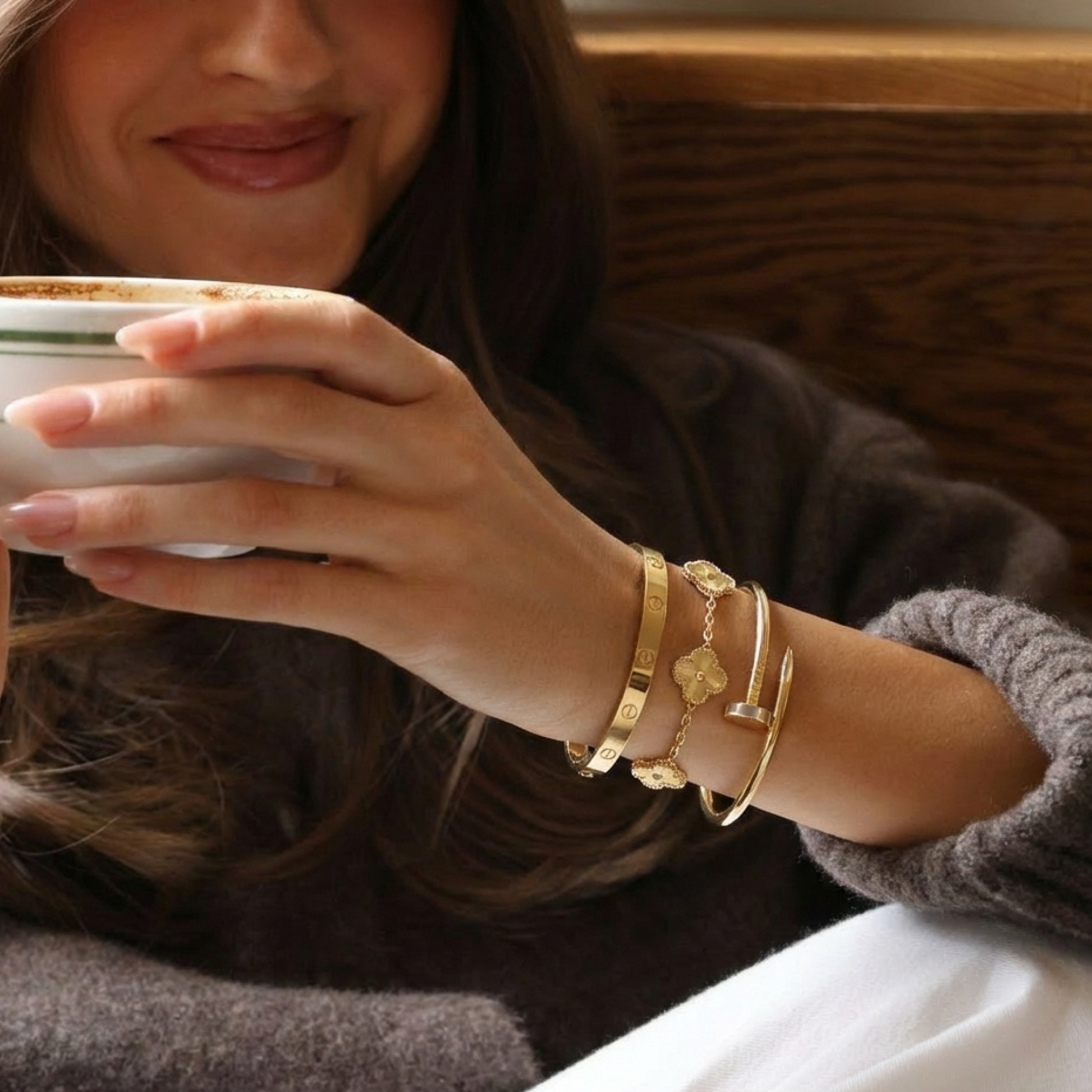 • Trinity & Clover Bracelet: A delicate and adjustable bracelet (16+5 cm) with charming details, available in gold or silver.